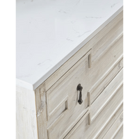 This exquisite quartz-topped entry cabinet can also function as a dresser, side cabinet, or media stand. It is constructed with a solid quartz top designed to resemble white and gray marble and a solid wood base with a white-wash finish. It features three large storage drawers, allowing ample storage space within this transitional-style cabinet. This would make a beautiful addition to any living room, bedroom or foyer.