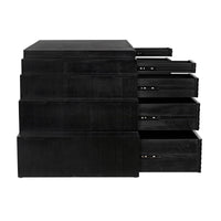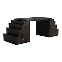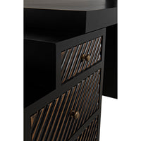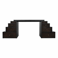 Unexpectedly elegant and decidedly decorative, the Ambidextrous desk has been artisan crafted of mahogany. Gorgeous carved details enhance the otherwise clean lines, and a squared base and turned accents provide additional ornamentation. Hand-rubbed black finish; brown trim.