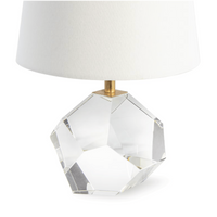 Add a splash of drama to your space with the hand-polished faceted clear crystal base of this modern mini lamp. Light, both natural and artificial cascade over and through the crystal facets creating a stunning light play to accent a shelf, etagere, desk, or side table. It is finished with gold leaf accents and a ball finial atop a tapered, natural linen shade. Add the Celeste Mini Lamp to your home office, bedroom, or living space.